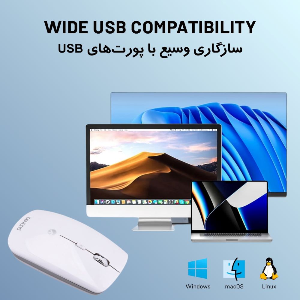 از ویژگی ماوس بیاند ماوس بیاند BM-1230 RF میتوان به اتصال از طریق دانگل USB به صورت Plug-and-Play و بدون نیاز به نصب درایور و نرمافزار و تنها با متصل کردن گیرنده USB به کامپیوتر اشاره کرد.