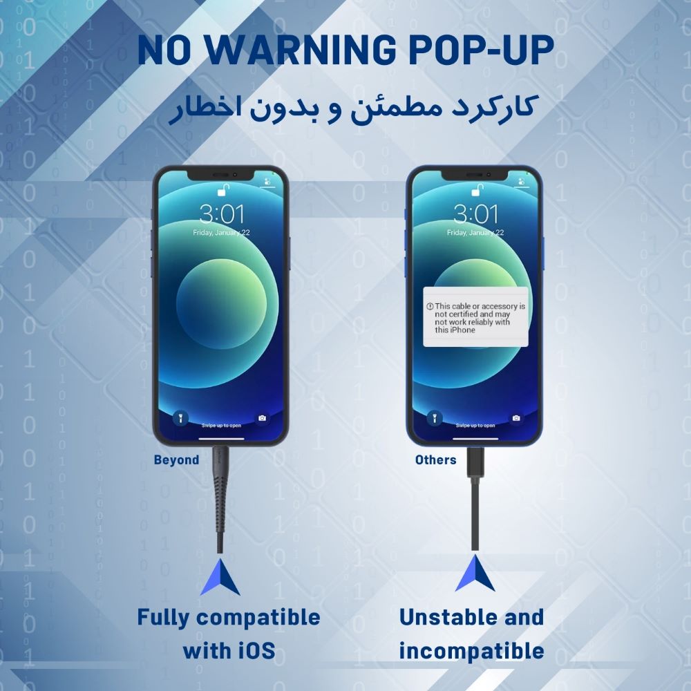 کابل بیاند BA-333 میتواند به شارژ و انتقال اطلاعات به دستگاههای Lightning شما بپردازد. این کابل کاملاً استاندارد بوده و به دلیل جلوگیری از جریانات مرتعش، در استفاده طولانی مدت به باتری دستگاه شما صدمهای وارد نخواهد کرد.