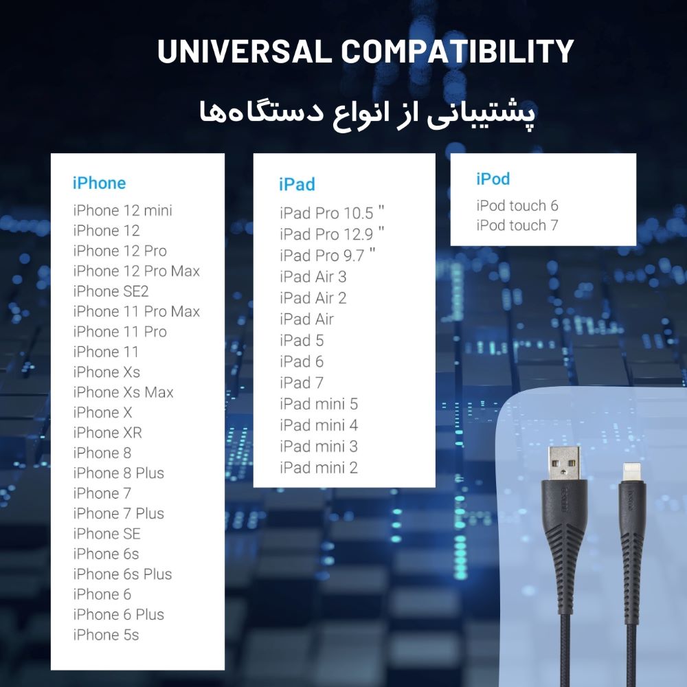 با این کابل میتوانید تمام دستگاههایی که دارای ورودی Lightning هستند مانند iPhone، iPad و AirPod را شارژ کنید و یا با اتصال به کامپیوتر و انجام عملیات Data Syncing به انتقال اطلاعات بپردازید.