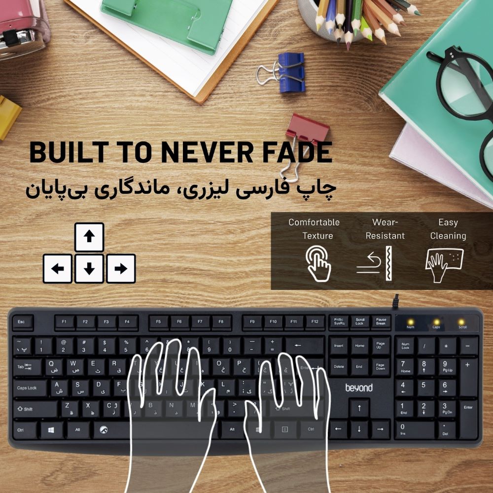 کلیدهای کیبورد بیاند BK-3870 دارای حروف فارسی هستند و چاپ با کیفیت بالای این حروف حک‌ شده باعث ماندگاری بالای آن‌ها شده‌ است.