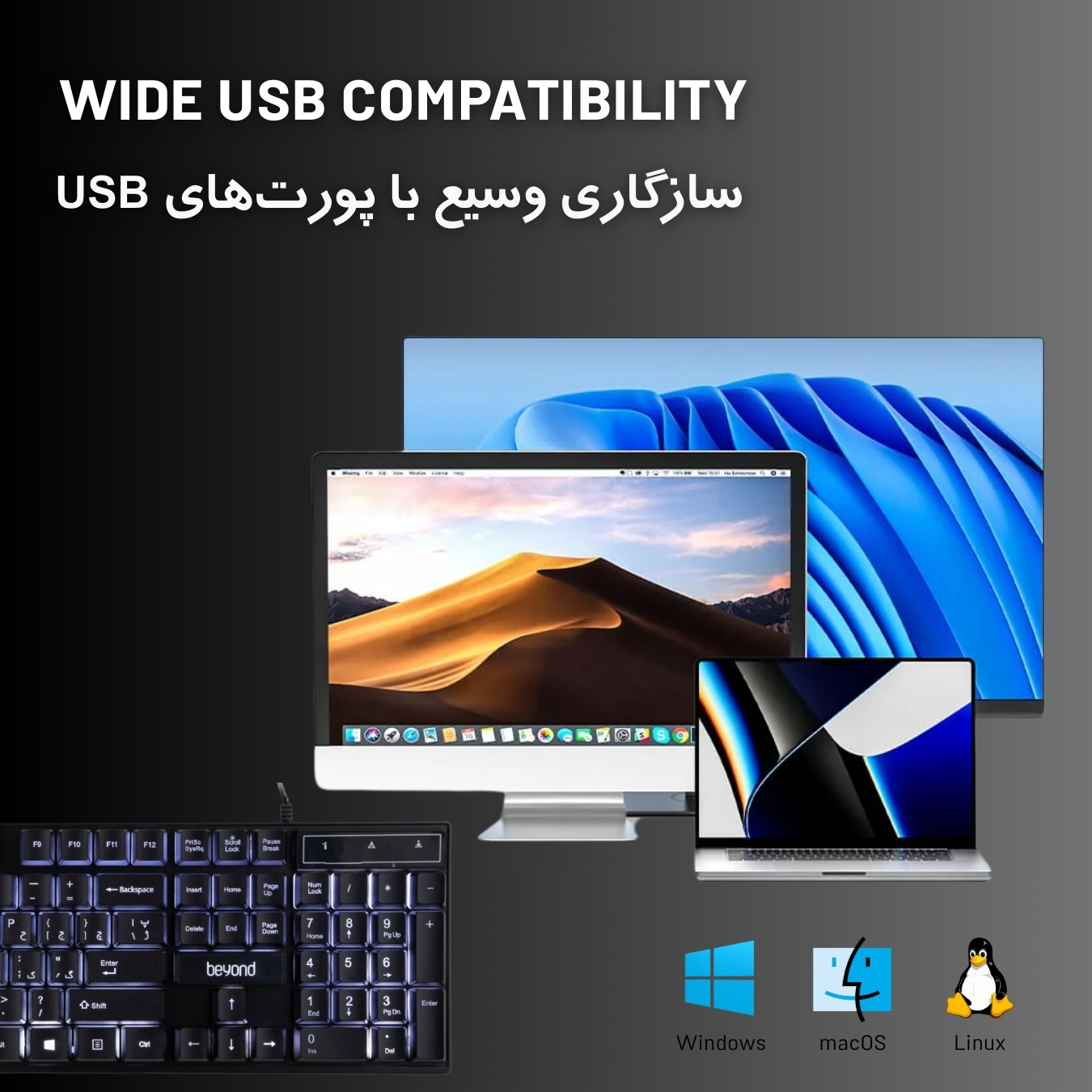 کیبورد بیاند BK-7110 با تمام نسخههای رایج سیستمعامل ویندوز، MacOS، لینوکس، اندروید و آی او اس سازگاری دارد.