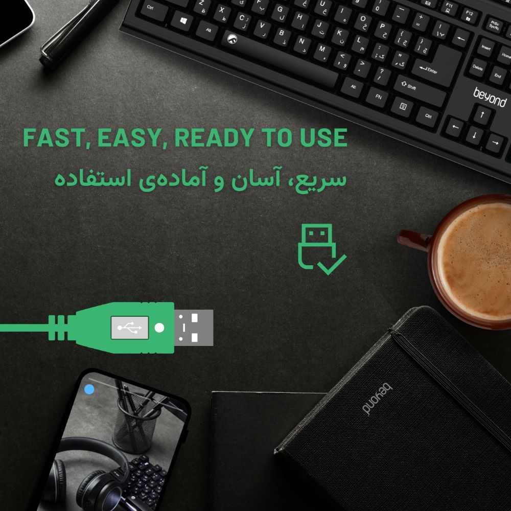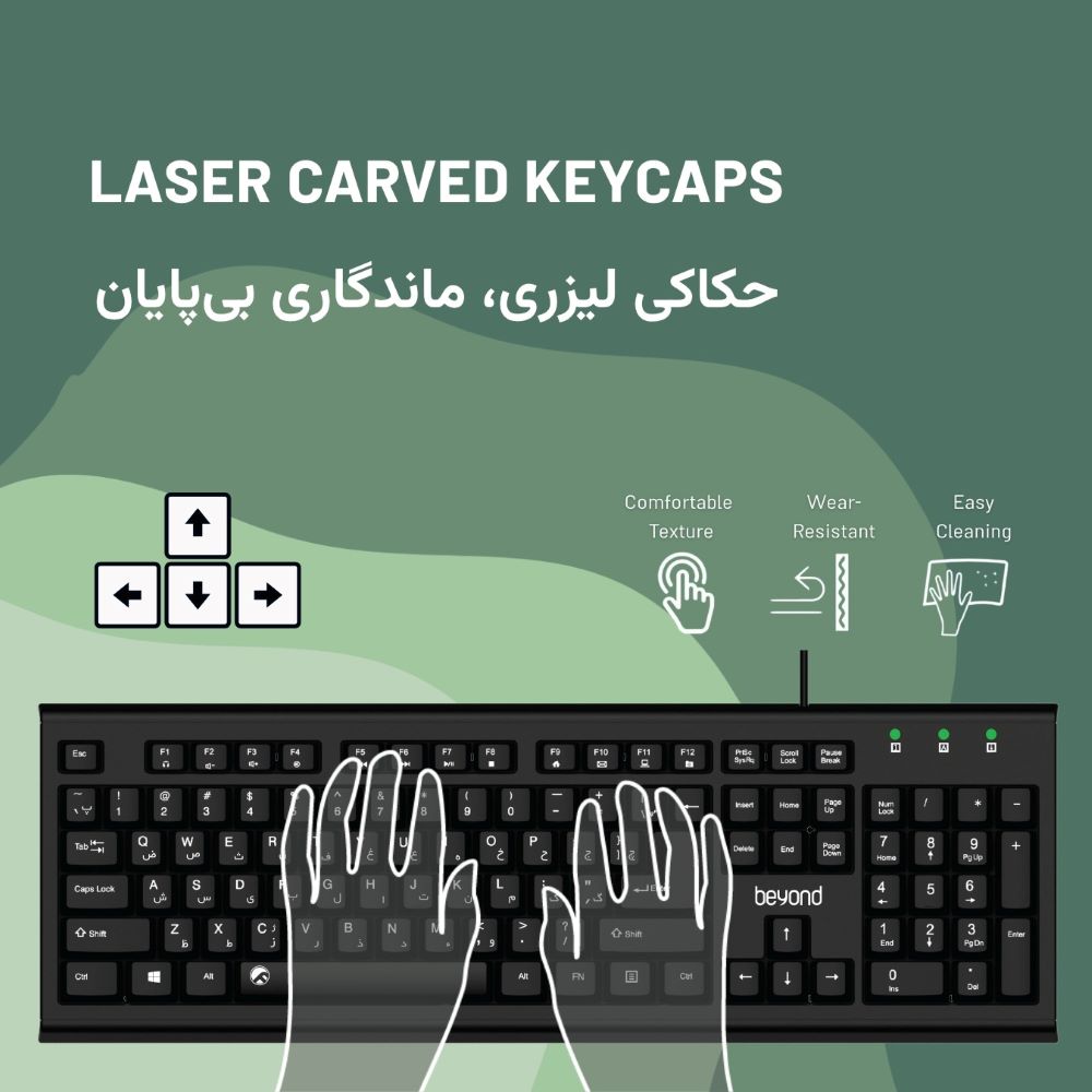 کلیدهای کیبورد بیاند BK-8305 دارای حروف فارسی هستند و چاپ با کیفیت بالای این حروف حک شده باعث ماندگاری بالای آنها شده است.