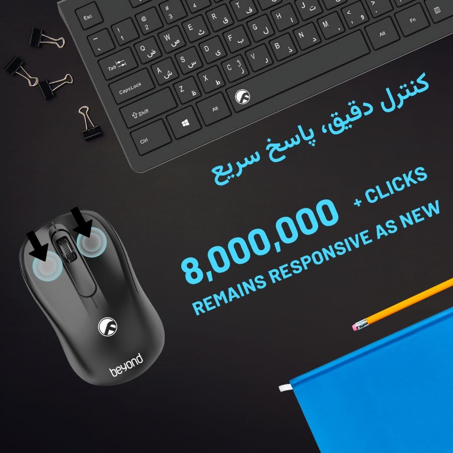 ماوس ست کمبو بیاند BMK-2890 RF از سوئیچهای با کیفیت و با دوامی استفاده میکند که با عمر بیش از 8 میلیون کلیک نیز همچنان واکنشپذیری بالایی را خواهد داشت.