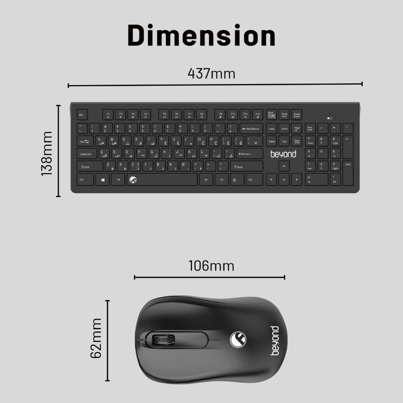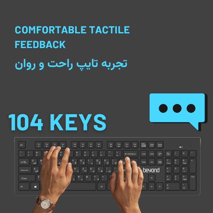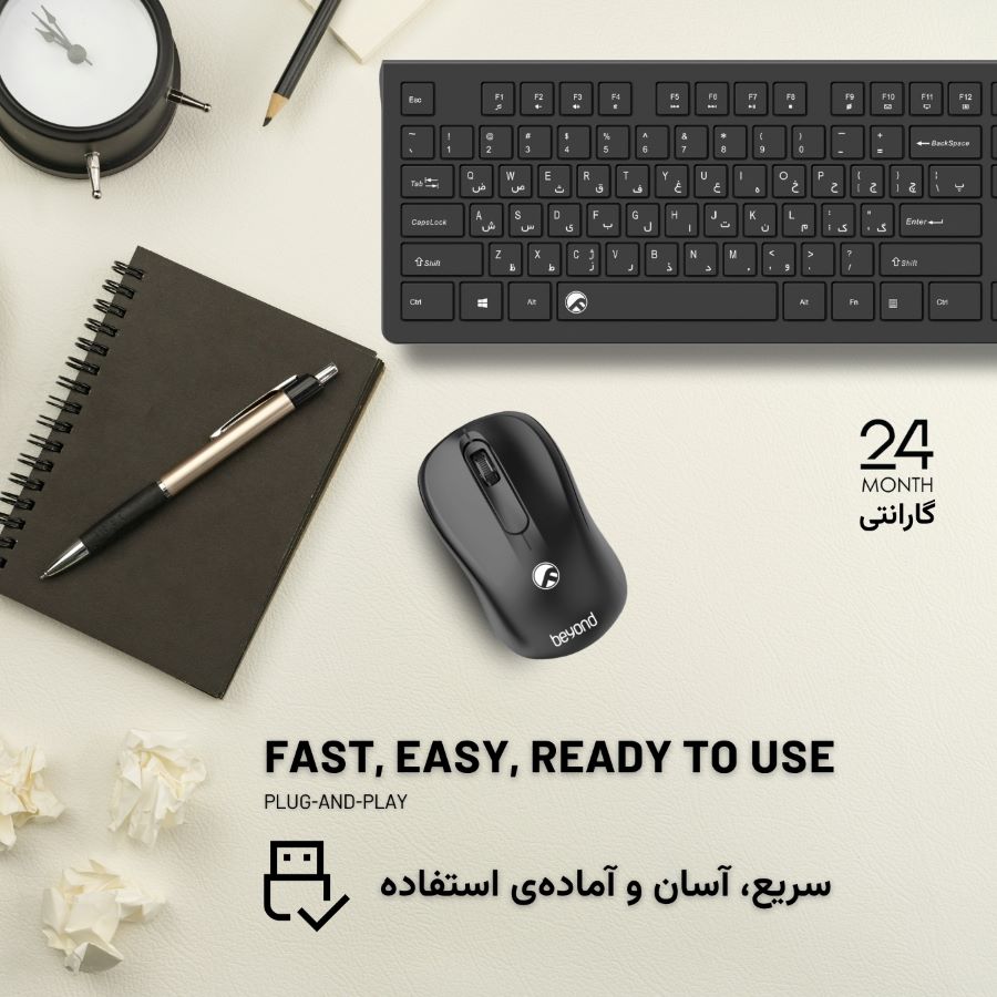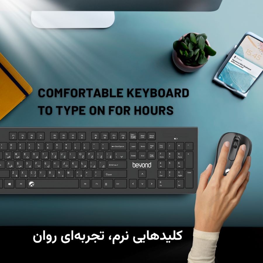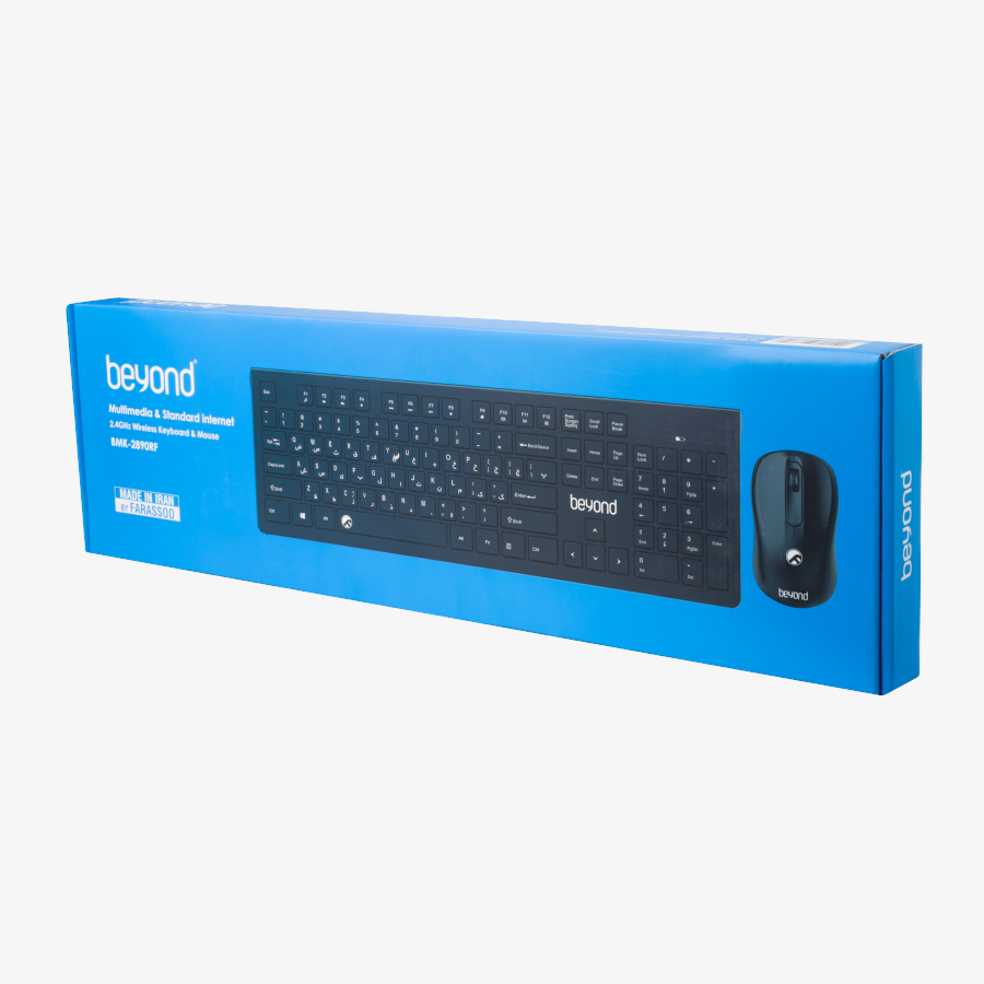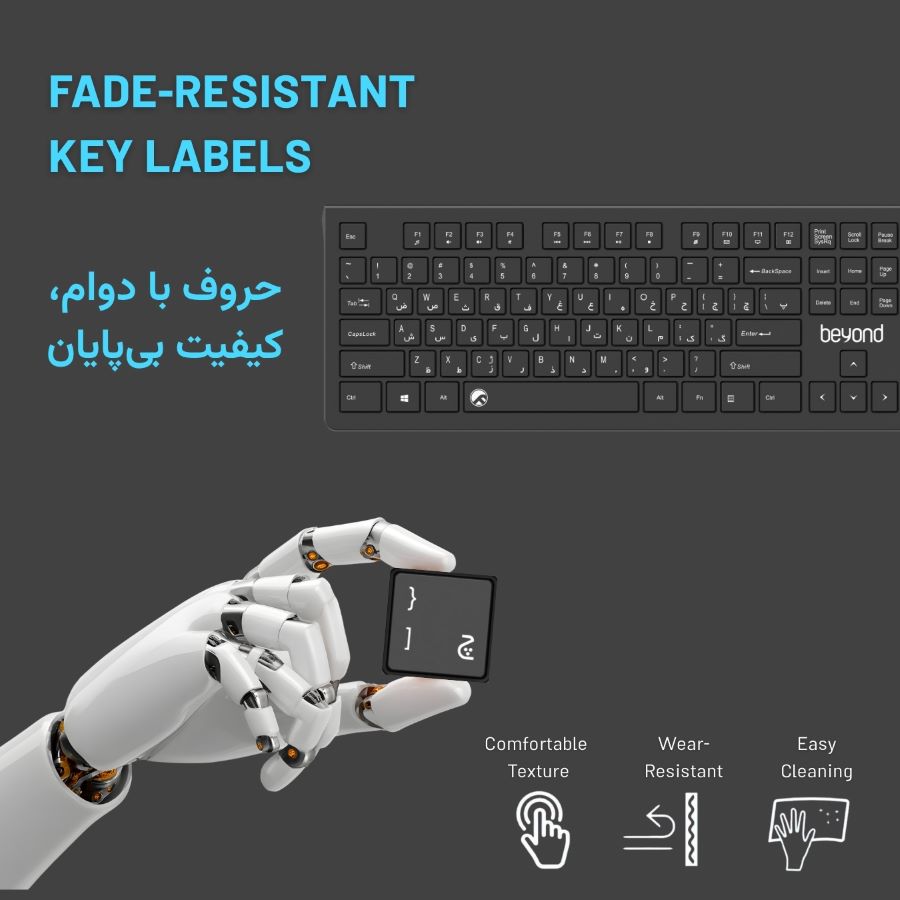 کلیدهای کیبورد ست کمبو بیاند BMK-2890 RF دارای حروف فارسی هستند و چاپ با کیفیت بالای این حروف حک شده باعث ماندگاری بالای آنها شده است.